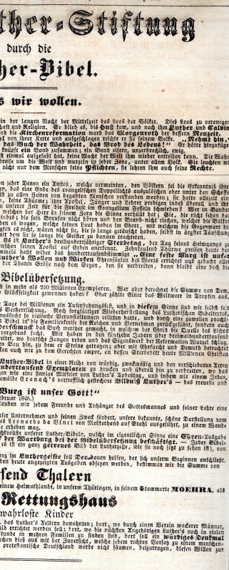* Eine Lutherstiftung durch Verkauf der Lutherbibel zum 300jährigen Sterbetag, bei welchen der Verlag pro zehntausend Bibeln "Eintausend Gulden" [Fettdruck] ..."zu einer Ehrenstiftung des großen Bibelübersetzers, welche wir in seinem Heimatlande, in unserem Thüringen, in seinem Stammorte Moehra, als "Luther's Rettungshaus" [Fettdruck] für verwahrloste Kinder errichten wollen". Genannt werden die Subscriptionsbedingungen von fünf verschiedenen Ausgaben und drei Prämierbilder. "Hildburghausen, am 18. Februar 1846". * (Ein Titel aus unserem Online-Katalog "Religion - Christentum: Kirchengeschichte - Martin Luther").