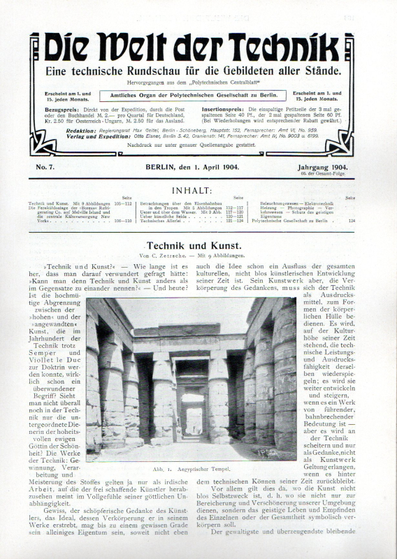 * "Technik und Kunst" (C. Zetzsche, mit 9 Abb.), "Betrachtungen über den Eisenbahnbau in den Tropen" (Rudolf Wagner, mit 5 Abb. vom Bau der Eisenbahn auf Madagaskar), "Unter und über dem Wasser" (mit 3 Abb. aus New York) u. a. * (Ein Titel aus unserem Online-Katalog "Technik und Verkehr - Eisenbahn").
