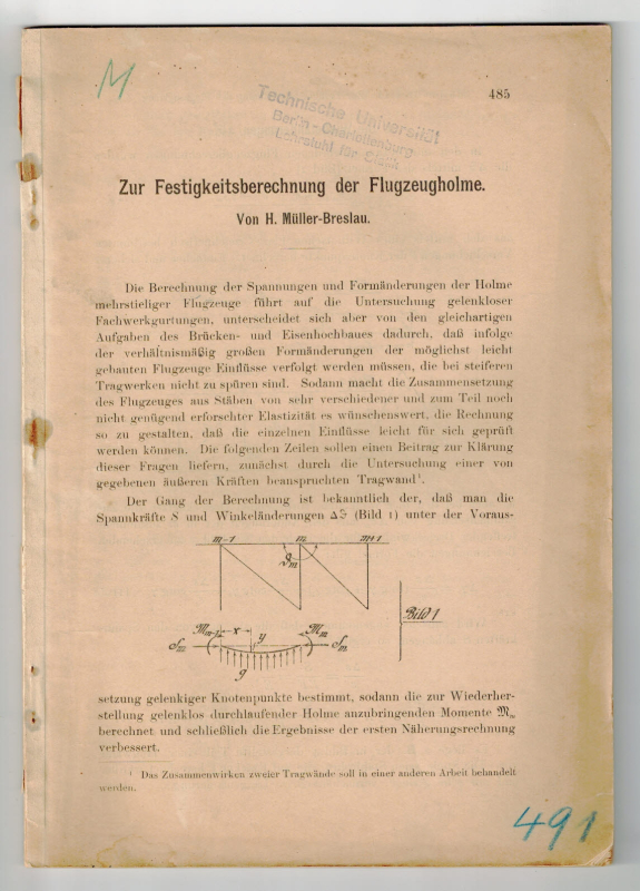 Ohne Druckvermerk [1916]. S. 485-543. 4°. Orig.-Geheftet (alt gestempelt Lehrstuhl für Statik Charlottenburg, Ränder gebraunt, Ecken best.). - Innen guter Zustand, jedoch 2 Blatt (S. 489-492) herausgeschnitten.