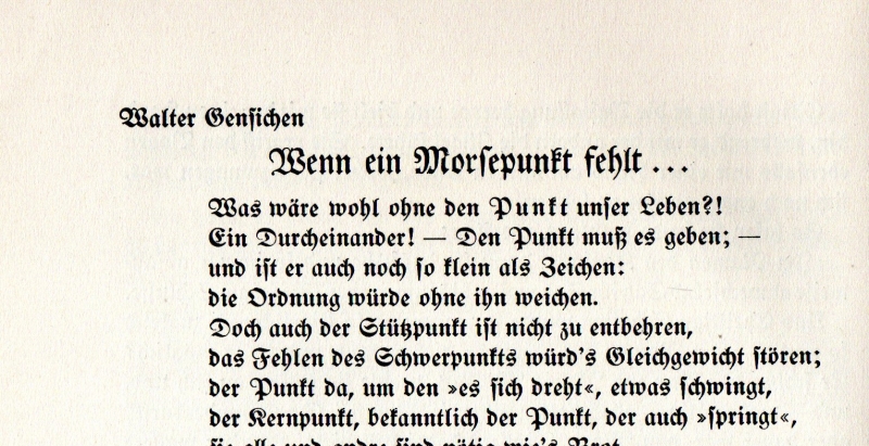 * In langen Reimen (beginnt: "Was wäre wohl ohne den Punkt unser Leben?!") über drei Seiten dieser Sachverhalt. Stichworte aus dem Text: Zeichen, Morsealphabet. Telegraphist, Drahttelegramm, Stephansbote, Tochter im Sündenbabel Berlin, fehlerhaftes Relais überträgt "ich bin Muter" statt Munter ("dem Strichpunkt der Morsepunkt unter den Tisch gefallen"). Nachfolgend von Frirtz Waschau zu Harburg (geb. Fürstenberg Kreis Büren, 1889) beginnend "Ein Telegrapensekretär, mit Namen Gotthold Meyerbeer...", in 12 Strophen über den im Amt verbotenen Handel (endet: "Im Ströungstagebuch zur Nacht / Ward folgender Vermerk gemacht: / Wenn du, mein Sohn in Sorge bist, Weil deine Leitung taktlos ist...") mit Passagen aus dem Text: "Am Abend als die goldbesternte Auffsicht sich entfernte, auch der TD das Amt verließ, dies legte Gotthold wie im Staat, aus seinen Morseapparat...Der Bahnhofsklopfer nicht mehr klopfte" (Sprotten unter dem Deckel vom Nachtdienst entdeckt wurden). - Ein Titel aus unserem Online-Katalog "Technik und Verkehr - Nachrichtentechnik".