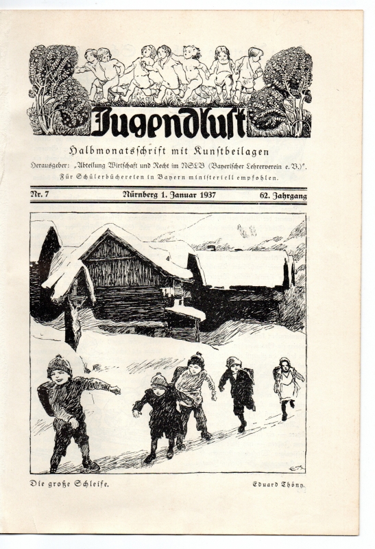 Nürnberg, Jugendlustverwaltung der W. Tümmel's Buchdruckerei 1937. S. (97)-112. 4°. Orig.-Geheftet (vorderseitige Illustration: "Die große Schleife" von Eduard Thöny, Kinder auf dem Schulweg auf eine glatten Fläche schlitternd). - Guter Zustand.