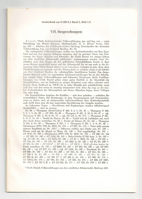 * Darin Rezensionen zu Rolf Wilhelm Brednich: Volkserzählungen und Volksglaube von den Schicksalsfrauen (von Karl Horálek, 6 Seiten), zu Ludwig Kohl-Larssen: Schwarzer Eulenspiegel. Ostafrikanische Schwänke (von Harald von Sicard, 3 Seiten), zuvor noch Besprechungen zu Ulrich Benzel: Sudetendeutsche Volkserzählungen und zu Laurits Bodker: Dänische Volksmärchen (beide von Fritz Harkort, jeweils mit Aufführung der Korrekturen und Ergänzungen alte zu neue Ausgabe und wertvoller Konkordanz zu Thompson, Stroebe u. a.