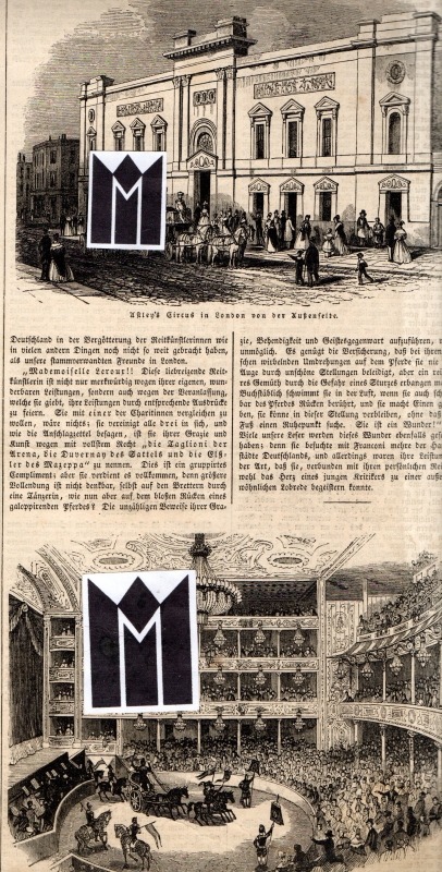 * Ansichten: "Camilla Lerour", "Astleys Circus in London von der Außenseite" (11,0 x 14,8 cm, Gebäude) und "Das Innere von Astleys Circus in London" (11,6 x 15,0 cm, Manege im Zirkus). * (Ein Titel aus unserem Online-Angebot "Volkskunde - Zauberer, Zirkus, Schausteller").