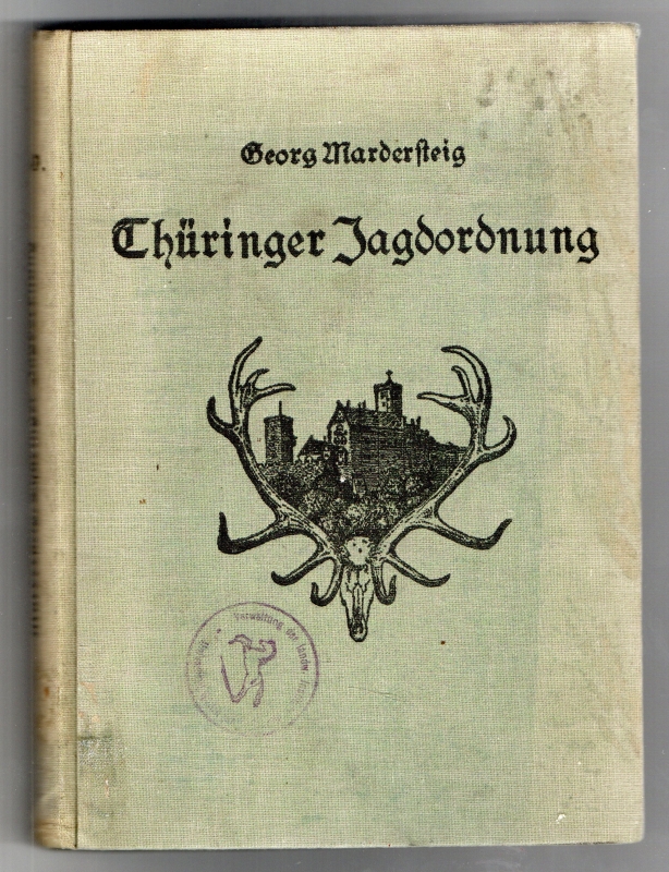 Weimar, Weimarischer Verlag 1926. 248 S. Illustr. Orig.-Leinen (Ansicht Wartburg eingefasst in 14-Ender), etwas Fleckchen, Stempel mit Pferdesymbol, Vorsatz mehrf. gestempelt und mit Exlibris. - Beiliegt: Georg Mardersteig: Zweite Ausführungsverordnung zur Jagdordnung vom 12. Juli 1926. Ebenda 1926. 7, (1) S. Orig.-Geheftet. - Titel mit drei sauberen neutralen Papieretiketten (einer davon mit Nummer) und dekorativ gestempelt (Pferdesymbol), Innen einige Lagen dto. gestempelt, sonst sauberer sehr guter Zustand. - Photo auf unserer Seite.