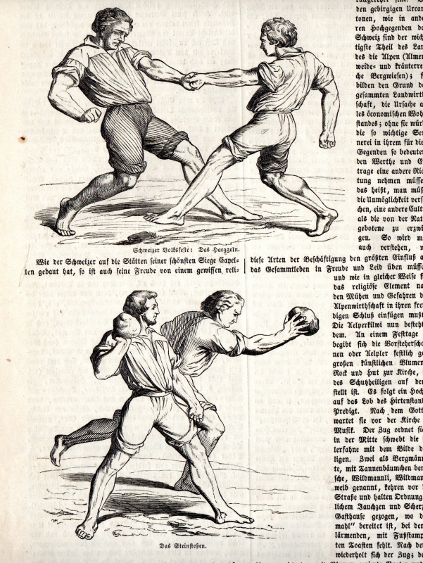 * Darstellungen: "Schweizer Volksfest: Das Haeggeln" [Fingerhakeln], "Das Steinstoßen", "Der Fliegendätsch", "Der Fleutischwung", "Das Grabaufziehen", Schalmeyenbläser", "Ein Ringkampf" und die Ansicht "Wettkampf und Ringfest auf dem "Brüel" bei Schwyz". - Stichworte: Schweiz, Sport, Schwingen, Ringen, Ringkampf, Kraftsport, Rasenkraftsport, Swiss Wrestling-Match. - (Ein Titel aus unserem Online-Katalog "Volkskunde - Sport").