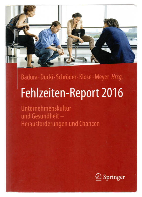 * Unter den Hauptkapiteln: "Was wird unter Unternehmenskultur verstanden?", "Zeit- und Leistungsdruck", "Vertrauen - Ergebnisorientiert - Eigenverantwortung", "Mitarbeiterbindung und Gesundheit", "Restrukturierung und Gesundheit", "Organisationsidentität, Unternehmenssprache und Führung multikultureller Teams" u. a., sowie "Praxisbeispiele", "Daten und Analysen". - Herausgeber: Bernhard Badura, Antje Ducki, Helmut Schröder, Joachim Klose, Markus Meyer. * ISBN 978-3-662-49412-7 *