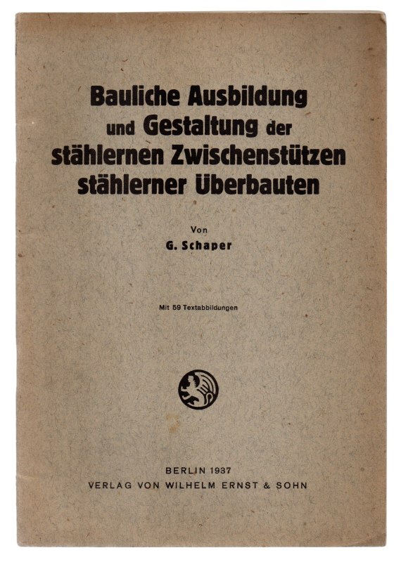 * Über Unterstützungen (Einzelstützen, Pendelrahmen, Tragwerke, Mittelstütze usw.) von "Geh. Baurat Dr.-Ing. ehr. Dr. techn. h. c. G. Schaper, Reichsbahndirektor" (Titel). Gottwalt Schaper (1873 Hohlstedt (Großschwabhausen) im Weimarer Land - 1942 Berlin, begr. Wilhelmshorst bei Potsdam) war Brückenreferent im Reichsverkehrsministerium, Erfinder der Schaper-Krupp-Reichsbahnbrücke (zuletzt 1991 gebaut am Teltowkanal). Unter den Darstellungen Autobahnbrücken, zwei Aufnahmen von der Sulzbachbrücke bei Denkendorf, sowie zahlreiche Beispiele von Straßenunterführungen.