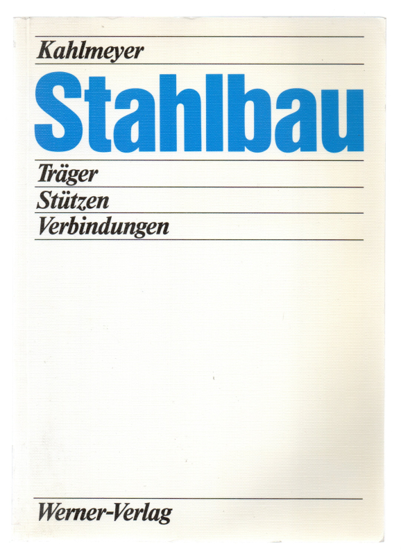 * Behandelt die Grundelemente des Stahlbaues, Berechnungstendenzen, europäische Knickspannungslinien, Trägerarten, Trägersysteme, gewalzte Vollwandträger, Traglastverfahren, drehelastische Abstützungen, Sützen, stabilisierende Bauteile usw., besondere Betonung finden die Verbindungen, Trägeranschlüsse, Auflagerungen, Unterzüge etc. Von "Prof. Dipl.-Ing. Eduard Kahlmeyer, Fachhochschule Bieldefeld, Abteilung Minden" (Titel). * ISBN 3-8041-2390-2 *