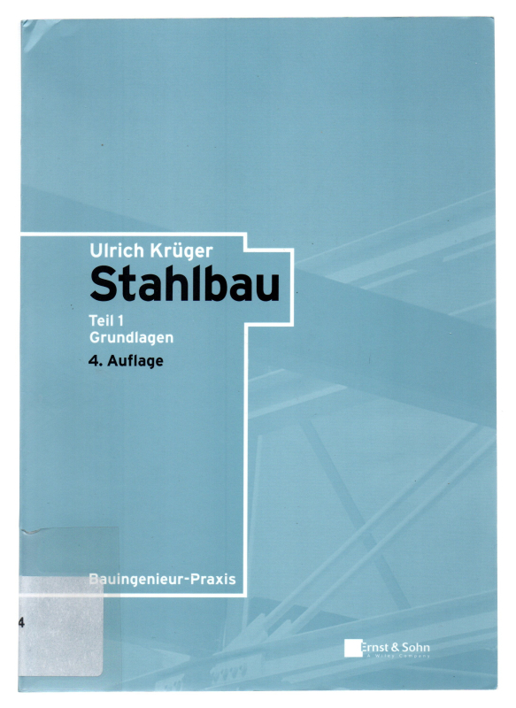 * Hauptabschnitte: "1. Stahlbau - Begriffe, Besonderheiten, Baubestimmungen. 2. Werkstoff Stahl und Stahlerzeugnisse. 3. Zeichnungen. 4. Bemessung von Stahlbauten. 5. Schraubverbindungen. 6. Schweißverbindungen. 7. Zugstäbe. 8. Druckstäbe. 9. Einachsige Biegung und Querkraft. 10. Druck und Biegung, zweiachsige Biegung. 11. Stützenfüße und Anschlüsse. 12. Träger - Anschlüsse und Stöße. 13. Rahmentragwerke. 14. Fachwerkträger und Verbände. 15. Objekt-Berechnung. A. Werkstattgebäude. B. Flachdachhalle als Rahmenkonstruktion. Anhang: Die wichtigsten Formeln für Stabilitätsfälle". * ISBN 978-3-433-01869-9 *
