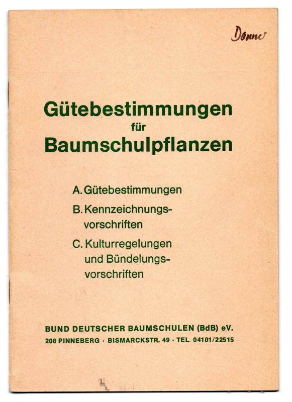 * Inhalt: A. Gütebestimmungen. B. Kennzeichnungsvorschriften. C. Kulturregelungen und Bündelungsvorschriften. - Bund Deutscher Baumschule (BdB), Druck Uetersen, Robcke). Stichwort: Baumschulen. * (Ein Titel aus unserem Online-Angebot "Wirtschaft - Gartenbau: Allgemeines").