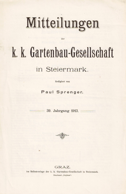 Graz, Verlag der k. k. Gartenbau-Gesellschaft in Steiermark 1913. Titel, 1 Bl., 180 S. Gr.-8°. Orig.-Geheftet. - Heft 1 erstes Blatt staubfleckig. - Selten.