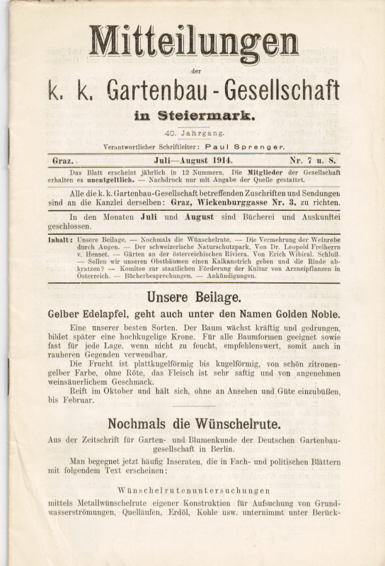 Graz, Verlag der k. k. Gartenbau-Gesellschaft in Steiermark 1914. 152 S. Gr.-8°. Orig.-Geheftet. - Heft 1/2 erstes Blatt staubfleckig und Ecke alt gestempelt. - Selten.