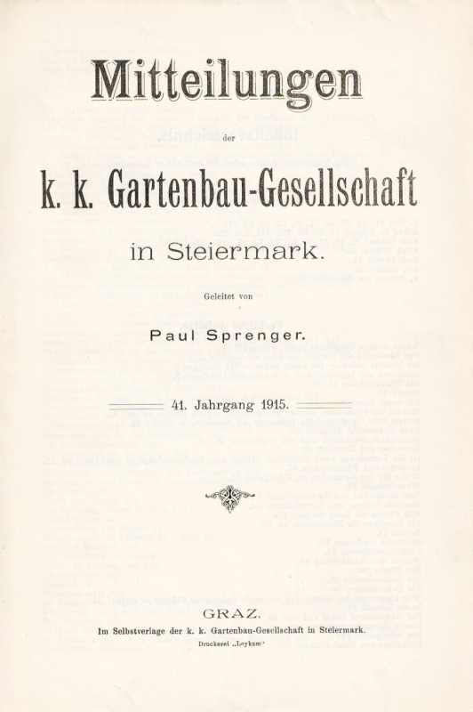 Graz, Verlag der k. k. Gartenbau-Gesellschaft in Steiermark 1915. Titel, 1 Bl., 160 S. Gr.-8°. Orig.-Geheftet. - Heft 1/2 erstes Blatt staubfleckig und Ecke alt gestempelt. - Selten.