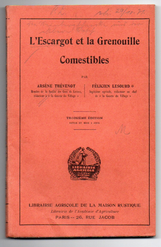 * Über die essbare Schnecke und den Frosch. [Weinbergschnecken und Froschschenkel, z. B. auf Baguette oder als Bouillon]. Von "Arsène Thévenot Membre de la Société des Gens de Lettres, rédacteur à la Gazette du Village" und "Félcien Lesourd Ingénieur agricole, rédacteur en chef la Gazette du Village" (Titel). Abbildungen der Zuchtanlagen, Sortierung, Verpackung usw. * Ein Titel aus unserem Online-Katalog "Wirtschaft - Gastronomie, Hauswirtschaft, Kochbücher".