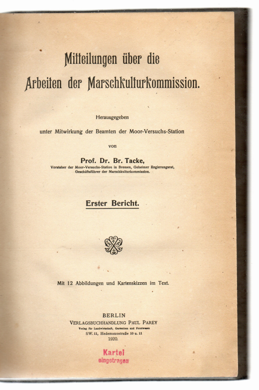 * Hauptkapitel: "I. Die Ergebnisse der Bodenuntersuchungen von Marschböden aus dem Gebiete der deutschen Nordseemarschen. II. Die Ergebnisse der im Arbeitsgebiet der Marschkulturkommission ausgestellten Einzelversuche. III. Die Versuche in der Marschversuchswirtschaft in Widdelswehr bei Petkum, Kreis Emden". Die Abbildungen sind Zeichnungen der Grundstücke und die Abläufe der Arbeitsweise darauf, einen Plan auch von der Fläche der Versuchswirtschaft in W. zu beiden Seien der Eisenbahn zw. Emspolder und Fehntjer Tief. * (Ein Titel aus unserem Online-Katalog "Wirtschaft - Moorwirtschaft").