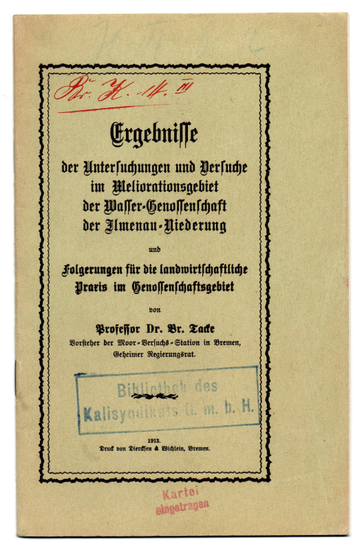 * Bodenverhältnisse, Wasserverhältnisse, Versuche und Ergebnisse , Verbesserungen der Wiesen und Weiden im Genossenschaftsgebiet. - Von "Professor Dr. Br. Tacke, Vorsteher der Moor-Versuchs-Station in Bremen, Geheimer Regierungsrat" (Titel, Bruno Tacke). - Stichworte für dieses Gebiet: Hoopte, Laßrönne, Winsen (Luhe), Tönnhausen, Mover, Hunden, Fahrenholz, Oldershausen, Horburg, Barum, Wittorf, Bardowick, Nettelburg. * (Ein Titel aus unserem Online-Katalog "Wirtschaft - Moorwirtschaft").