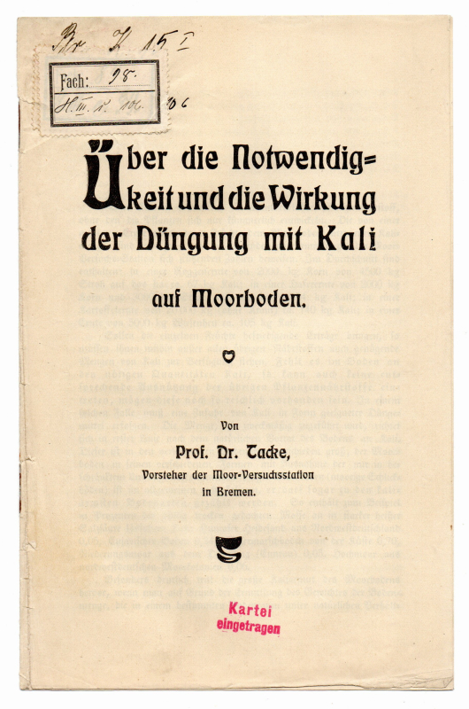* Von "Prof. Dr. Tacke, Vorsteher der Moor-Versuchsstation in Bremen" (Titel, Bruno Tacke). Unter dem statistischen Material das Verwendung fand, ist das jüngste von 1898, in dem Jahr wurde der Verfasser auch zum Professor ernannt. * (Ein Titel aus unserem Online-Katalog "Wirtschaft - Moorwirtschaft").