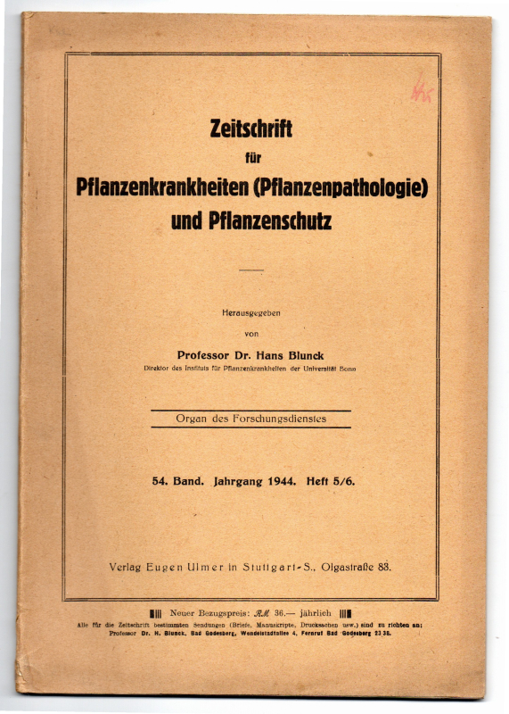 Zeitschrift für Pflanzenkrankheiten (Pflanzenpathologie und Pflanzenschutz). Mit 3 Abb. und 8 Tabellen. Daran anschließend (ab. S. 138 bis 153): Alfred Meuche (Bonn, gef. 1942 an der Ostfront): "Zur Überwinterung des Rapserdflohs (Psylliodes chrysocephala L.). Mit 3 Abb. und 3 Tabellen.