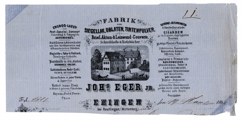 Johs Eger jr. Eningen bei Reutlingen, (Württemberg). Fabrik von Siegellak, Oblaten, Tintenpulver, Brief- Akten- & Leinwand-Couverte, Schreibhefte & Notizbücher.