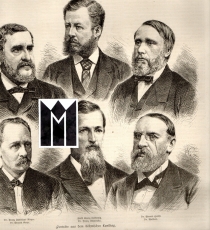 Textlegende: "Dr. Franz Ladislaus Rieger, Fürst Georg Lobkowitz, Dr. Eduard Herbst, Dr. Eduard Gregr, Dr. Franz Schmeykal, Dr. Waldert". - Schlagwort: Stadtansicht, Landtag von Böhmen zu Prag.