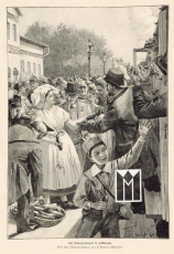 * Bahnhof Lübbenau im Spreewald: Aus einem Eisenbahnwaggon steigen Fahrgäste auf den Bahnsteig bzw. schauen aus den Fenstern auf die Verkäufer mit Spreewälder Gurken (Spreewälderin, Junge) und lassen sich die Ware reichen.