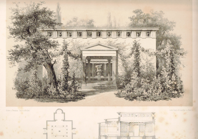 * Ein Impluvium wie der Grundriß zeigt, als Gartenpavillon Atrium verstanden, bzw. mitunter in neueren Beschreibungen irrig auch als Stibadium bezeichnet. - Botanischer Garten Potsdam, Paradiesgarten.