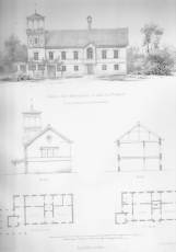 Ansicht, darunter Grund- und Seitenrisse. Tonlithographie von Loeillot nach v. Arnim.