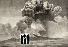 * Bei nächtlicher Szene mit in der Ferne erleuchteten Häusern vom Meer aus. Vorn rechts ein Dampfer. - Vulkanologie, Volcanology, Vulcanologia, Volcanologie, Vesuvio.