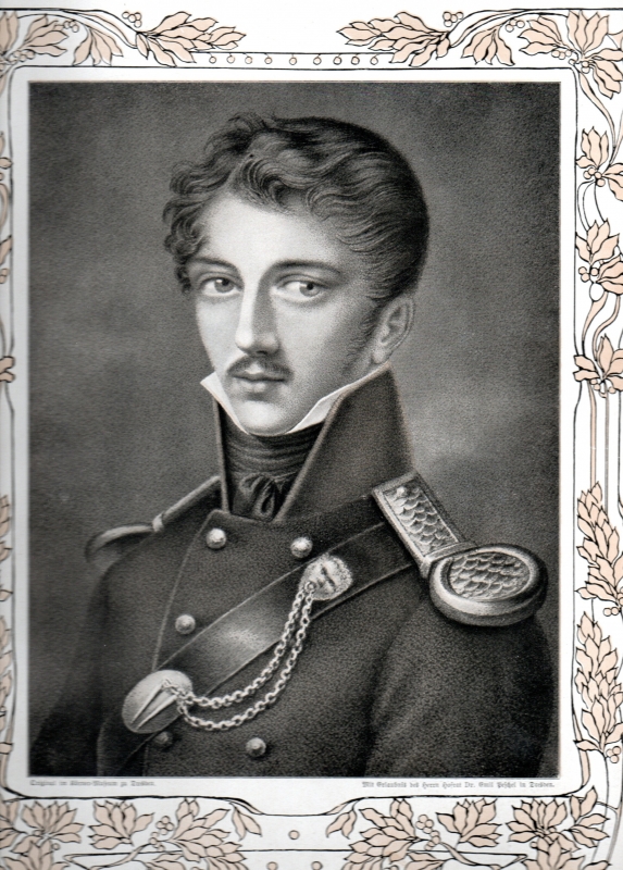 Brustbild in Uniformjacke. Nach einer Kreidezeichnung von Emma Körner. Porträt auf Kunstdruckblatt mit floralen beige getönten Jugendstil-Schmuckrahmen. Autotypie nach Original im Körner-Museum zu Dresden.