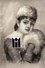 * Brustbild einer jungen Frau mit Muff und Kappe aus Gänsefedern.