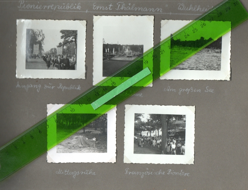 * Privates Album einer FDJ Funktionärin aus Oelsnitz (Vogtland). Photoabzüge im üblichen Kleinformat. Hochglanz mit Büttenrand. Sauber beschriftet: "Auf nach Leipzig! / IV. Parlament der FDJ Pfingsten 1952", "Abmarsch in Oelsnitz - Bahnhof" (5), "Aufmarsch zur Kundgebung auf dem Augustusplatz / Leipzig Augustusplatz" (9), "Demonstrationen zum Königsplatz" (9, Gruppen in FDJ Uniform, Turnerinnenkleidung u. a., eine Gruppe mit Banner "Freie Deutsche Jugend /Landesverband Mecklenburg" dahinter wird großes Bild von getragen) und nochmal "Demonstration zum IV. Parlament der FDJ" (10, Trommler, Fahnen u. a.). - Stichworte: Freie Deutsche Jugend, Sozialistische Einheitspartei Deutschlands SED, Junge Pioniere, DDR, Kommunisten.