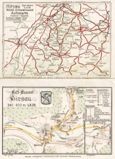 * Gefaltete Doppel-Postkarte: Oberes Segment mit Übersichtskarte "Nördl. Schwarzwald Autokarte" unteres mit "Luft-Kurort Hirsau 340-600 m. ü. d. M." (Plan mit Umgebung, farb. Wappen und Nebenplan "Ernstmühl", Ausdehnung Plan: Schweinbachtal, Ottenbronner Steige, Haugstetter Steige, Sonnenbad [Freibad], dazu Erklärungslegende mit Einzeichnungen der Hotels, Gaststätten und Pensionen). Innenseitig über beide Kartenhälften aufgeklappt die topographische Umgebungskarte mit Wanderwege, von (im Uhrzeigersinn) Bad Liebenzell bis Stammheim, Zavelstein und Oberkollbach. - Zur Datierung: Autobahn endete noch vor Baden-Baden.