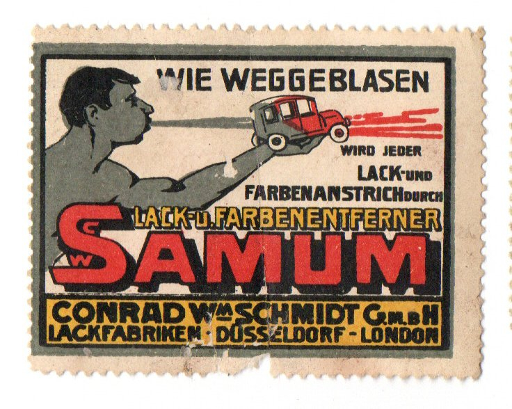 "Konrad Wm Schmidt G.m.b H Lackfabriken-Düsseldorf-London". Athletischer Mann auf Auto pustend. Dreifarbige Reklamemarke.